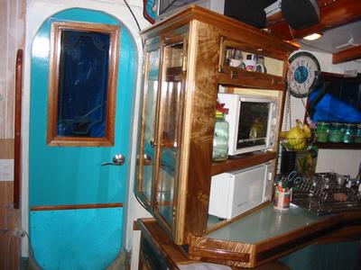 So it was becoming a beautiful yacht with myrtlewood cabinets in the galley, curved, laminated cedar beams with mahogany trim and mahogany galley table which makes into a bunk.