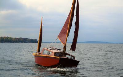 Unique features; EYES (“bird’s eye view”)... Pram Bow... Shallow Draft (two shallow bilge keels and skeg/rudder combo)... Single Lee Board (weather board)... Comfortable Cabin with, 54” interior height, large windows, queen berth, two 32” settees and a portable toilet... Spacious Cockpit... Unique Hull Shape (generous rocker fore & aft, arched across and hard chines)... Skinned with Large Ply Panels (easy when shown how!)... Yawl Rig with Gunter Main (mast in tabernacle)... Positive Floatation (six sealed chambers) and Sails to Windward in just 12”-14”water!