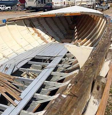 "Remora" is a 1928 Herreshoff 12½, which needs significant repair.