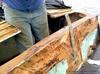 The bow topsides had had a nasty prang at some time in her history and after removing the bog and rot, Dennis laid three layers of cedar strips diagonally.